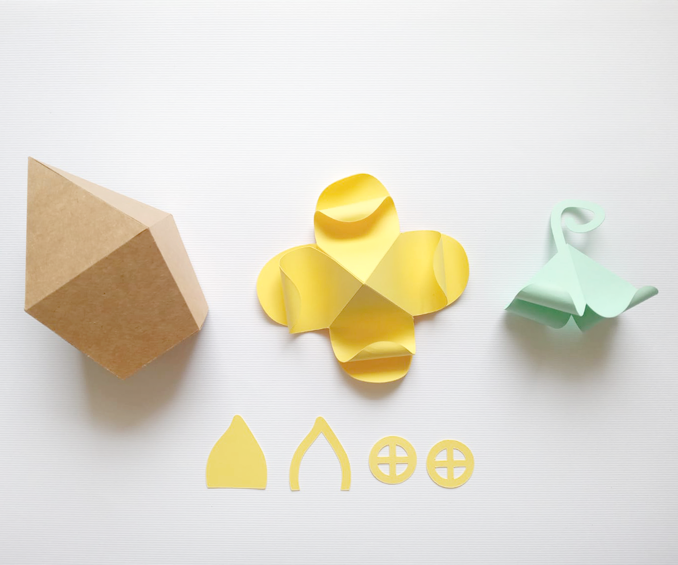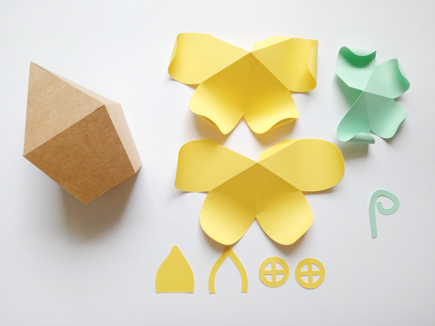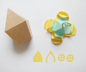 Depois disso, é só colar a flor como se fosse o telhado da caixinha e colar a portinha e janelas.