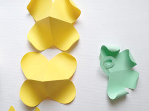 Antes de colar a florzinha do teto, eu modelei as pétalas utilizando uma dobradeira de papel. Como eu fiz em duas camadas de pétalas, uma eu modelei mais do que a outra.