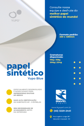 O Yupo Blue é um papel de altíssima qualidade, indicado para impressões em impressoras da linha HP Indigo. Ele é extremamente flexível, o que o torna ideal para impressões que devem atender a prazos mais curtos.