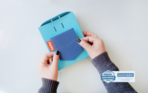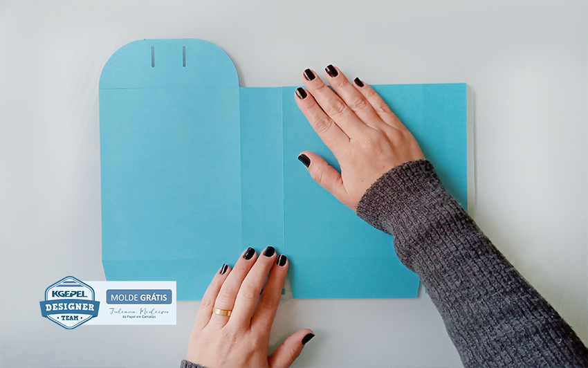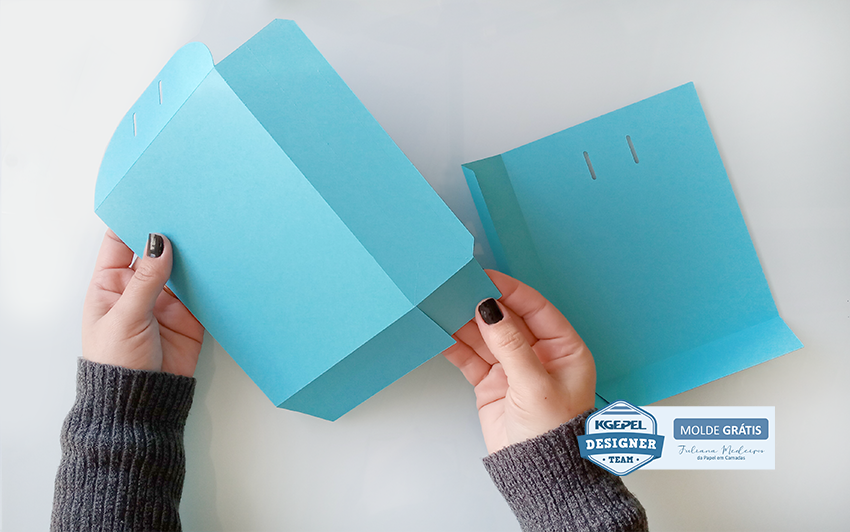 Com o molde cortado, vamos dobrar os vincos e colar as laterais da sacolinha que é composta por duas partes.